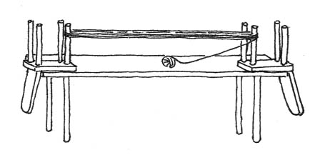 If you don't happen to have two firmly planted poles conveniently placed in the middle of your living room, use two chairs upside down on a table as shown in Figure 9. These can also be used for measuring out lengths of thread.
